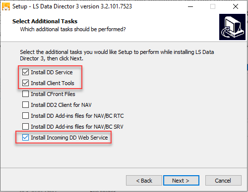 - In the task selection window, make sure that the top two check boxes and the bottom check box for Web service setup are selected.