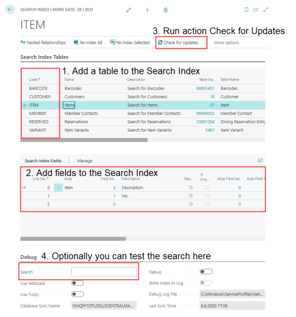 OnInsert() UpdateIndex(0); OnModify() UpdateIndex(1); OnDelete() UpdateIndex(2); OnRename() UpdateIndex(3); LOCAL UpdateIndex(Type : Integer) //Type: 0 = INSERT, 1 = MODIFY, 2 = DELETE, 3 = RENAME RecRef.GETTABLE(Rec); xRecRef.GETTABLE(xRec); POSSearch.UpdateIndex(RecRef, xRecRef, Type); - An update action is created in the table POS Search Action (10000769) for every entry changed.