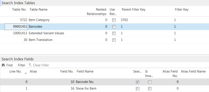 - For example, to search for a barcode and get the related item as a result, define the Item (27) table as a parent search table, then the Barcodes (99001451) table as a nested relationship then set: