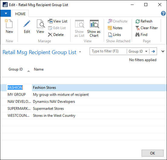 Recipients Groups can be created for Retail Messages. The groups can be selected in the Recipients FastTab in the Retail Message card for a quicker selection of multiple recipients.