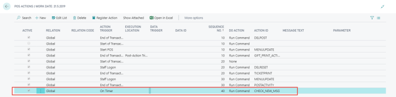 - To enable the POS-Idle event and connect it to the above Command, open the Actions page. Search for POS Actions and add a new Action line as shown in the image below: