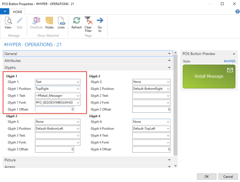 To make the Glyph for the new message appear, open the Glyphs FastTab in Button Properties and enter parameters as follows (the font that is used here is #FO_SEGOESYMBOLWH20):