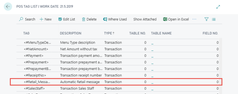The <#Retail_Message> tag is used to configure the Retail Message button on POS. Make sure that the tag is present in the POS Tag List. If it is not in the list, add a new line by clicking New and insert the exact same values in the fields as shown in the image: