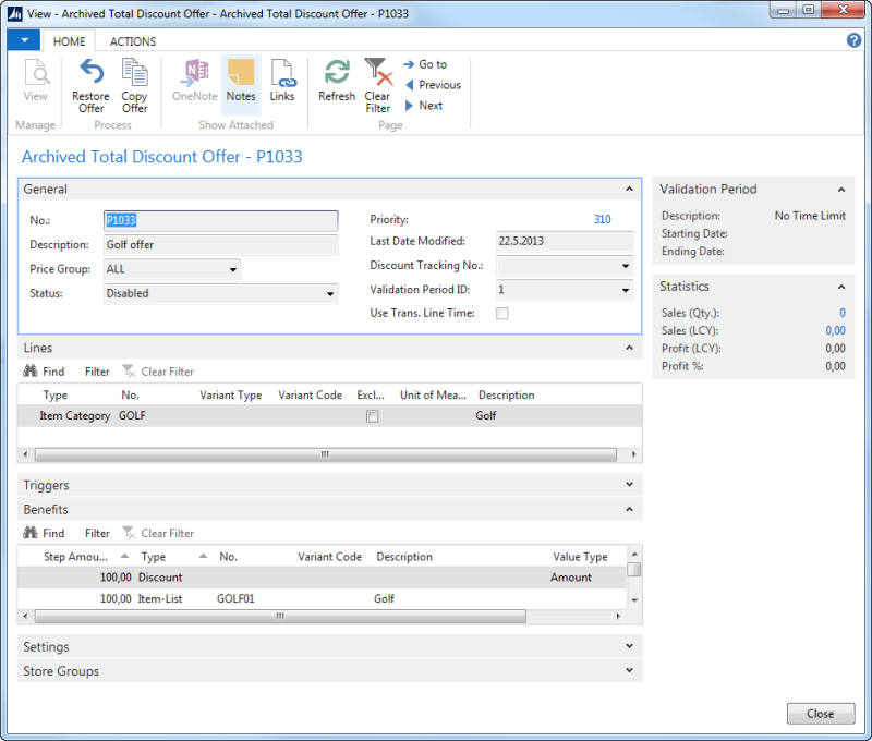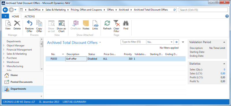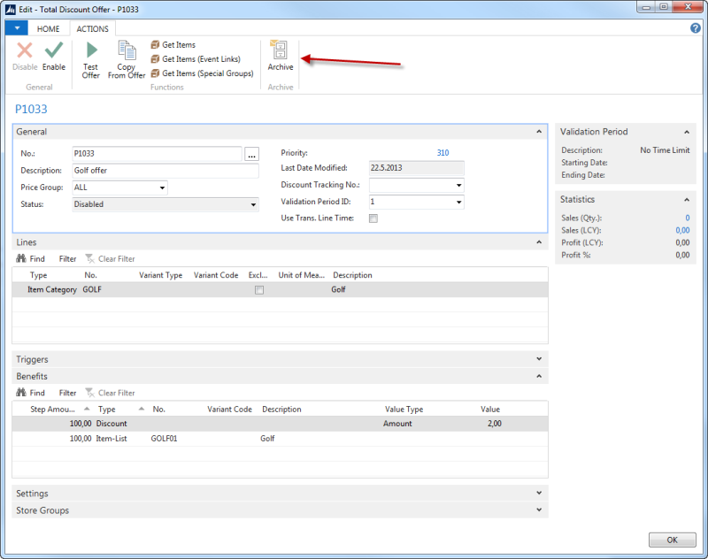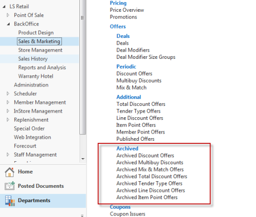 Offers can be archived by a scheduled job or manually by using the Archive action in the offer card pages. Offers stored in the Discount Offer table (99001453) can be archived. When an offer is archived the offer data is copied to archived tables and deleted from the working tables. This will make all processing with offers faster especially priority changes and POS operations.