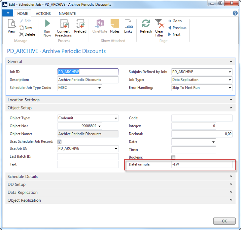 Disabled offers can be archived by using the PD_ARCHIVE Scheduler Job. This job archives all offers in the table Periodic Discount that have the status Disabled and that have expired. It is possible to send a parameter with the job if you want to archive offers that expired some time ago. In this example offers that expired one week ago or earlier and are Disabled will be archived: