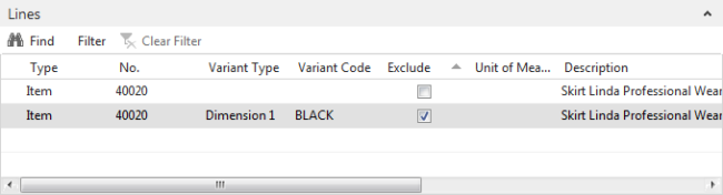 Note: It is also possible to exclude items by selecting the check box in the Exclude column. Example: Item 40020 is discounted except the black skirts: