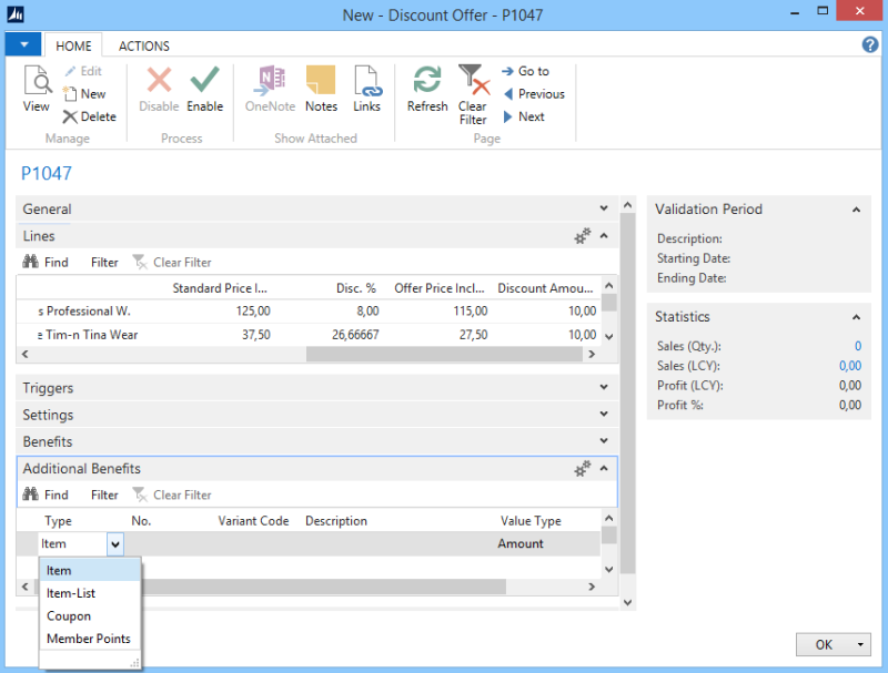On this FastTab it is possible to set up optional benefits that a customer can get from the offer, for example: