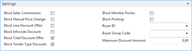In this example the customer cannot get Total Discount and Tender Type Discount in addition. Only offers that are examined later than the current offer in the price calculations can be blocked.