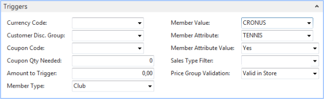 If no fields are filled out the offer is valid for all customers. Triggers therefore limit the group of customers that can benefit from an offer. Another example is when the user needs to bring a coupon to activate an offer. Several other activities or attributes can trigger an offer. The Member Management module and the Coupon functionality are closely tied to this functionality.