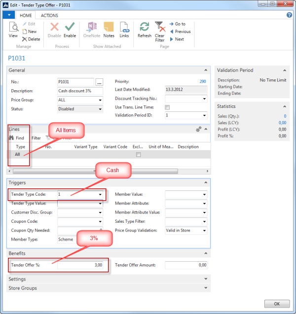 The Tender Type Offer is an offer that is connected to a tender type. If the customer pays with that tender type the offer is triggered. The offer is only valid for the items that are listed in the Lines FastTab.