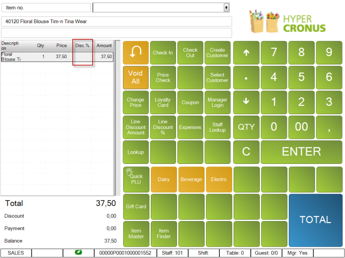 On the POS we first enter item 40120, Floral Blouse Tim-n Tina Wear. This item is in the Discount Offer Tim-n Tina Wear for 40 - 25% off displayed above.